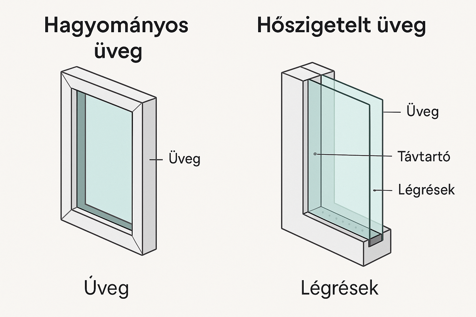 A hagyományos egyrétegű üvegezés kiváló megoldás lehet belső terekben, műhelyekben, fészerekben vagy ideiglenes nyílászárók esetén. Ez a típusú üveg alapvető védelmet nyújt a szél és csapadék ellen, ugyanakkor nem hőszigetelő, ezért fűtött lakóépületekbe csak korlátozottan ajánlott. Gazdaságos választás, ha egyszerű, gyors és költséghatékony üvegcserére van szükség. Az egyrétegű üvegezést jellemzően 3–4 mm vastagságú síküveggel végezzük, amely könnyen szabható és gyorsan beépíthető. Megbízható megoldás lehet például régi típusú ablakok, beltéri ajtók vagy vitrinek esetében. Régi bérházak és családi házak esetében ezért sok esetben 2 ablakszárny található.